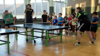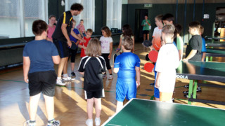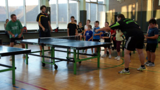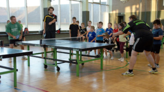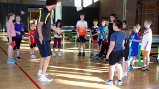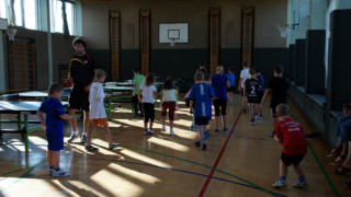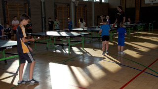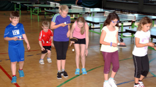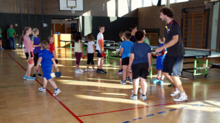 Da gut die Hälfte der Kinder bereits Erfahrungen beim Tischtennisspiel hatten, konnten diese bei einem kleinen Turnier sich gegenseitig messen. Die „Neulinge“ in Sachen Tischtennis sammelten viele Erfahrungen im Umgang mit Ball und Schläger. Weiter ging es dann mit einigen Übungen um ein Gefühl für den Ball und die passende Schlagstärke zu bekommen. So durften die Kinder auf einer Bank balancieren und dabei sollte der Ball ruhig auf dem Schläger liegen bleiben. Um die passende Schlagstärke heraus zu bekommen, musste der Ball mit der Vorhand geschlagen werden und bei einmaligem Aufspringen auf dem Hallenboden sollte der Ball dann in einer Kiste zum liegen kommen.