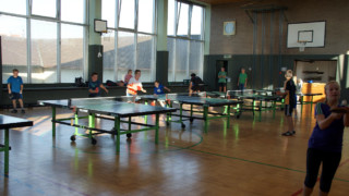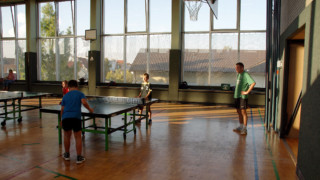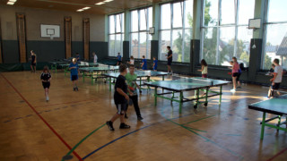 Kurz vor dem Ende der herrlichen Sommerferien veranstalteten wir einen Schnupperkurs und 17 Jungen und Mädchen verbrachten ein paar interessante Stunden beim Tischtennissport. Dominik Förg begrüßte die jungen Tischtennisspieler und erklärte einige Grundbegriffe zu dieser Sportart. Wie in jedem Training gehört das vernünftige Aufwärmen der Muskulatur dazu und so durften die Kinder einige Runden in der Halle laufen. Dabei versuchten sie den Ball auf dem Schläger zu balancieren. Da dies gar nicht so einfach ist, wie es beim Zuschauen wirkt, mussten einige der jungen Spieler feststellen.